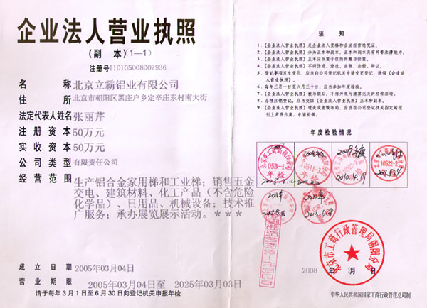 北京立霸鋁業(yè)有限公司是集研發(fā)、生產和銷售各種鋁合金工業(yè)型材、管材、板材、鋁合金梯子材料及梯子配件、鋁合金梯子、絕絕梯子、鋁合金液壓升降平臺等系列產品的專業(yè)廠家。